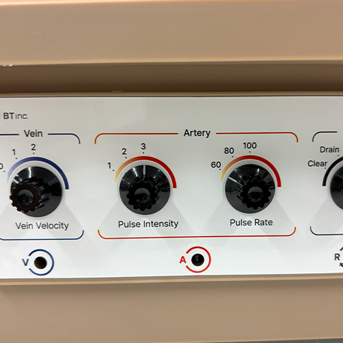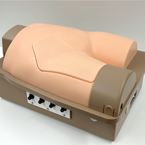 「直接動脈穿刺法による採血」における大腿動脈の拍動確認、穿刺手順、圧迫止血まで一連のトレーニングを行なえます。穿刺痕からの液漏れを最小限に制御する内部排水システムに加え、大腿動脈の脈強度・拍動調節、大腿静脈の流速調節機能により、習熟度に応じた難易度設定も可能です。