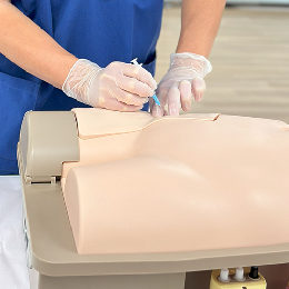 アレンテスト、橈骨動脈の穿刺、動脈血の採血、動脈ラインの留置など橈骨動脈穿刺の一連のトレーニングを行うことができます。 脈強度と拍動の調節が可能で、学習者の習熟度に応じたとレーニングを行うことができます。リアルな触感と拍動、逆血も再現されており、皮膚と血管が一体型の交換パッドは、セットアップやメンテナンスの手間を軽減します。